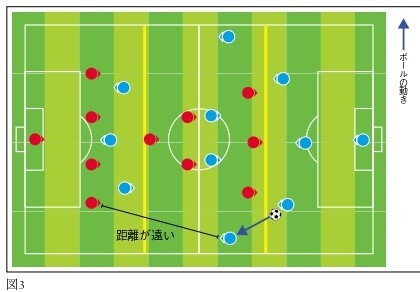 3トップに3対3でプレスをかけられた3バックはサイドのWBを使えばよい。このWBに対して4バック側はSBを押し出すには距離が遠すぎる。スライドしているうちにWBには前を向いて有効なプレーを繰り出す時間が十分に与えられてしまうだろう。4バックはここでも後手を踏まされているわけだ。