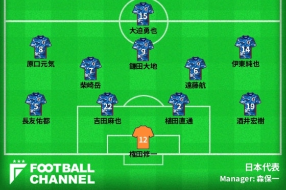 GKは森保ジャパンにおける正守護神となっている権田修一。サイドバックには酒井宏樹と長友佑都のベテラン二人が入っており、冨安健洋不在で板倉滉も離脱したセンターバックには吉田麻也と植田直通が起用されている。