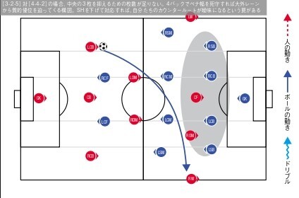 SHを下げて対応するチームが増えていたが、最初から5バックで守備の基準点をはっきりさせることのほうが得策と考えるチームが増えていき、サイドチェンジからのアイソレーションはゆっくりと姿を消していった。サイドチェンジをしても相手が側にいるからである。