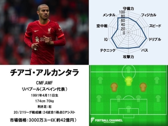 バルセロナ出身のチアゴ・アルカンタラは、卓越した「テクニック」と「IQ」を武器に活躍している。18歳のときにバルセロナでトップチームに昇格し、ペップ・グアルディオラ監督が就任したバイエルン・ミュンヘンに13年夏に移籍。昨年9月にはリバプールへと移籍している。バルセロナとバイエルンでUEFAチャンピオンズリーグ制覇を経験し、両クラブで計12度のリーグ優勝を知っている。30歳ならが多くのタイトルを味わってきた。