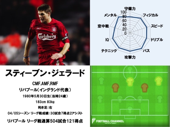 基本データはUEFAチャンピオンズリーグ(CL)を奇跡的な逆転勝利で制し、UEFA年間最優秀選手に輝いた04/05シーズンのもの。得点数やアシスト数においては倍以上の数字を残したシーズンもあるが、誰よりもチームプレイヤーだったジェラードのとって最高のシーズンといえるのはこの年だろう。