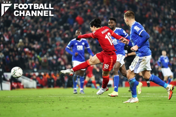 後半アディショナルタイムに入ってもレスターのリードは覆らず、リバプールは敗退濃厚かに思われた。そこで輝いたのが、すでに1アシストを記録していた南野だった。95分、ミルナーが右サイドの浅い位置からアーリークロスを上げると、ボールはクリアしようと跳んだレスターのMFウィルフリード・ディディの頭を越えて南野の足もとに届く。