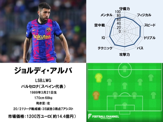 「80」という数値を記録するなど、「IQ」の高さもジョルディ・アルバが評価される理由の一つ。相手の背後に抜け出すタイミングが常に抜群で、ピッチ内の状況に応じてインナーラップとオーバーラップを巧みに使い分けることもできる。以前に「僕のプレースタイルによって困難を与えたいと思っている」とコメントをしていたが、まさに捕まえづらい厄介な存在である。