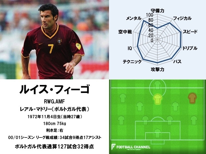 加えて、フィーゴが当時世界最高クラスの選手となった理由として、高い「IQ」、強靭な「フィジカル」、そして常に冷静な「メンタル」の強さがある。つまり、フィーゴという選手は欠点のない完全無欠のサイドアタッカーだった。