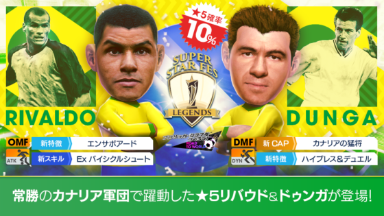 好評配信中のスポーツ育成シミュレーションゲーム『プロサッカークラブをつくろう! ロード・トゥ・ワールド』(以下 「サカつくRTW」)では、ブラジルのレジェンド「ドゥンガ」、「リバウド」が新★5選手として登場する“SUPER STAR FES LEGENDS”を、4月27日(水)より開催中!