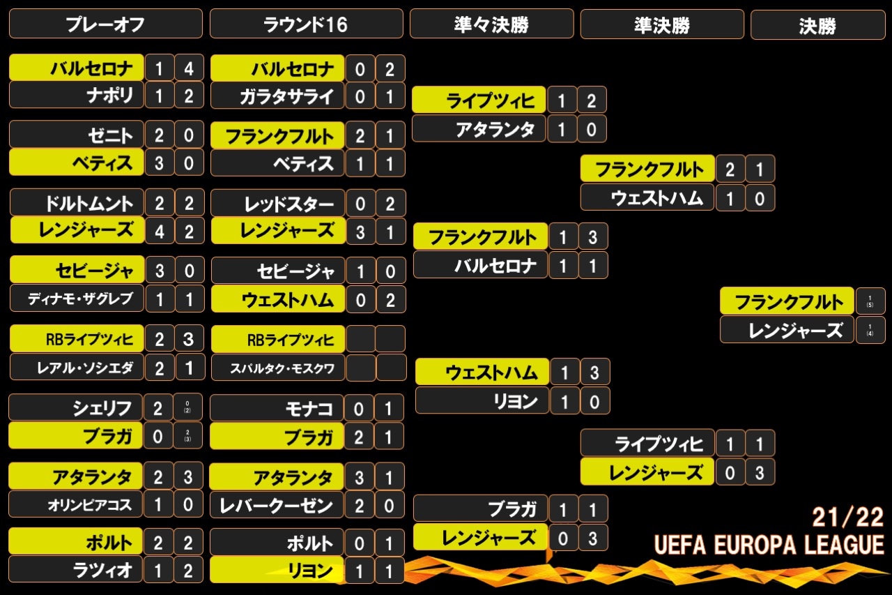 海外サッカー 4年前 【EL】決勝トーナメント表 UEFAヨーロッパリーグ21/22<組み合わせ> text by 編集部 UEFAヨーロッパリーグ 最新ニュース 決勝トーナメント表 UEFAヨーロッパリーグ2021/22(EL)の決勝トーナメント表は下記の通り。プレーオフではELグループステージ2位チームと、UEFAチャンピオンズリーググループ3位チームとが対戦。勝者はELグループステージ1位も参加するラウンド16に進む。 クリックして画像を拡大する RBライプツィヒ TV中継 TV放送 アイントラハト・フランクフルト アタランタ アヤックス ウェストハム オリンピアコス ガラタサライ コラム シェリフ スパルタク・モスクワ ゼニト セビージャ ディナモ・ザグレブ テレビ中継 テレビ放送 ドルトムント ナポリ ニュース バルセロナ ブラガ ベティス ポルト モナコ ラツィオ リヨン レアル・ソシエダ レッドスター・ベオグラード レバークーゼン レンジャーズ 中継 日程 欧州サッカー 海外サッカー 組み合わせ 結果 試合日程 試合結果