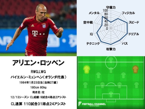 ロッベンがCLを制したのは、バイエルン在籍時代の12/13シーズン、前年に本拠地でチェルシーに敗れる屈辱的敗戦から汚名返上となる優勝を果たしたシーズンである。ドルトムントと同国対決となった決勝では、1ゴール1アシストという圧巻の活躍で優勝の立役者となった。
