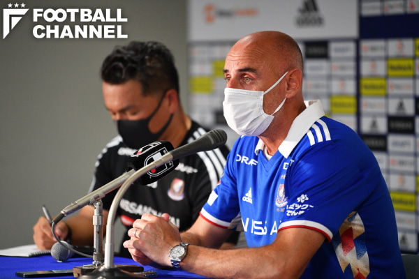 日産スタジアムの記者会見室で珍しい光景を目にした。横浜F・マリノスを率いるケヴィン・マスカット監督が、フィールドプレーヤー用の青いユニフォーム姿で現れたのである。