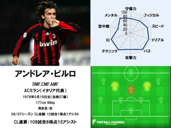 近年のチャンピオンズリーグにおいて、最も輝きを放ったイタリア人選手といえば、アンドレア・ピルロだろう。ACミランのレジスタとして2度の優勝に貢献するなど、その存在感を示し続けた。