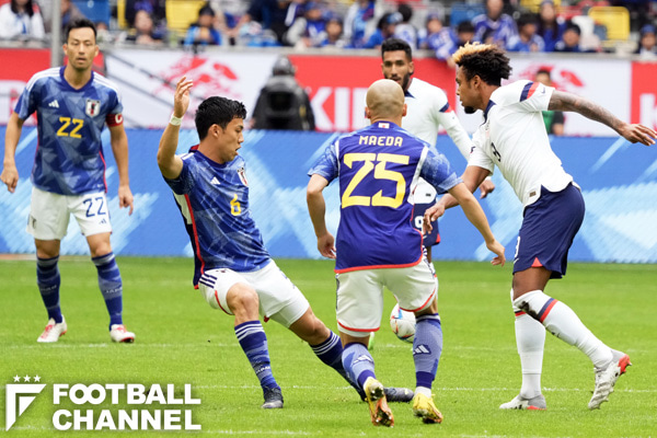 1トップに起用された前田大然が持ち前のスプリントの速さを生かし、相手DFやGKに圧力をかけている。久保建英も鋭い寄せで守備面でも貢献していた。米国代表はあまりコンディションが良さそうではなかったが、日本代表は機動力を生かした守備で相手にミスを連発させ、それを攻撃に結びつけることに成功していた。