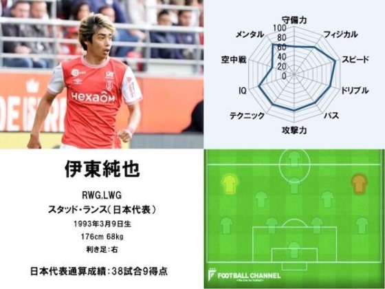日本代表で任されるのは右ウイングのポジション。「89」をたたき出した圧倒的な「スピード」は、欧州でもトップクラスの数字だ。「ドリブル」で縦に切り込むだけでなく、中央にカットインして左足でゴールを狙うこともできる。迷うことなく仕掛ける「メンタル」の強さも伊東が欧州で活躍できる理由となっている。