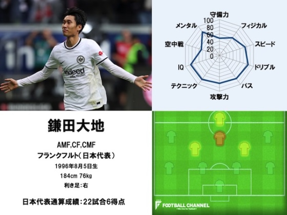 「フィジカル」や「スピード」の数値は決して高くない鎌田が活躍できる理由は、技術の高さと状況判断の速さにある。相手の隙間を縫うように「ドリブル」で切り込み、決定的な「パス」を送る。自らゴールを決める決定力も兼ね備えており、相手の隙を突く「IQ」の高さはブンデスリーガでもトップレベル。太々しいほどに物おじしない「メンタル」の強さは、かつての司令塔・中田英寿や本田圭佑に通じるものがある。