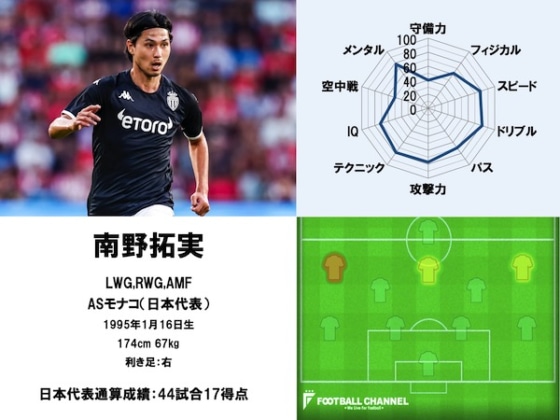輝かしい実績を持つ南野の特徴は「77」となった「攻撃力」の高さ。タイミング抜群の動き出しでフリーとなり、一瞬の隙でゴールを奪う。「メンタル」の強さも特筆すべきものがあり、レッドブル・ザルツブルク時代にはリバプールを相手に豪快なゴールを決めて敵地を騒然とさせたこともあった。