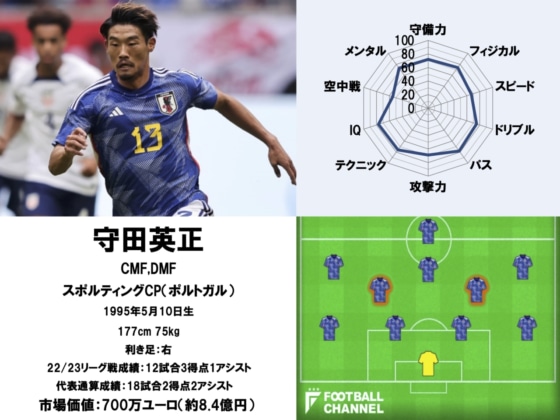 ポルトガルの強豪スポルティングCPでも主力を張る守田は、日本屈指の万能型だ。川崎Fで培った高い「パス」センスや「テクニック」、「ドリブル」を武器に、組み立てから崩しに至るまで幅広く貢献する。ピッチ上の状況を瞬時に理解できるなど「IQ」もハイレベルであり、軽率な判断ミスなどを犯すことが少ない。常に安定したプレーを発揮できるのは、そうしたスキルに加え「メンタル」も成熟しているからと言えるかもしれない。