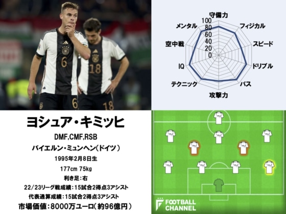「スピード」こそ「68」とやや低めだが、ポジショニングの良さと豊富な運動量でそれを完璧にカバーしている。彼がピッチにいるいないでチームのバランスが変わるほどの影響力であり、「ピッチ上の指揮官」とも言えるキミッヒを抑えることができなければ、日本代表がドイツ代表を倒すことは難しいだろう。