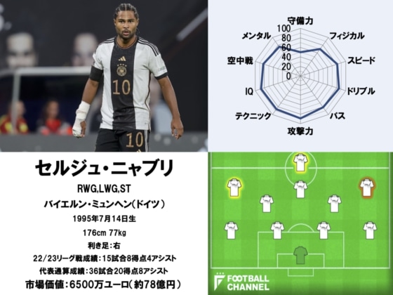 ニャブリの魅力は何と言っても「攻撃力」だ。2016/17シーズンからブンデスリーガで6シーズン連続となる二桁ゴールを記録している。「89」は実力者が揃うドイツ代表でもトップの数字だ。この「攻撃力」を可能としているのがいずれも「80」以上の「スピード」と「ドリブル」であり、個の力で局面を打開してシュートに持ち込むことができる。