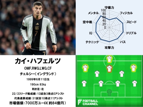 ハフェルツはエアマスターと言えるほど「空中戦」に強い選手ではないが、190cmという上背を存分に生かせており、それは「80」という高い「空中戦」の能力値でも証明されている。それでいて足元に吸い付くようなトラップが持ち味で、ボールコントロールを間違えることはほとんどない。「テクニック」は「85」と彼の能力値で最も高い数値を叩き出している。