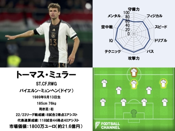 その一方で「スピード」は「69」とFWの選手の中では低めの能力値だが、これは先述した「IQ」の高さで補っており、ポジショニングの巧さでカバーしている。派手な得点こそ少ないが、こぼれ球の前に確実にミュラーがいるケースは多く、常に考えてポジションを取っている。マークを外す動きにも長けているため、相手DFからすると捕まえにくい相手となるだろう。