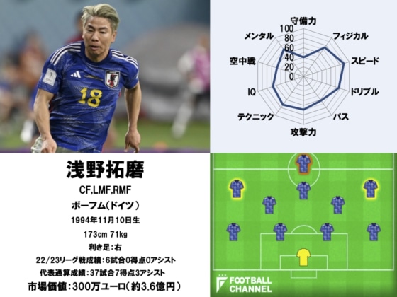 しかし、「攻撃力」はFWとしてはかなり低い「69」。快速を生かして裏へ抜け出すまではいいが、フィニッシュの精度が低く、日本代表でもこれまで何度か決定機を外してきた。また、「テクニック」も凡庸で、前線でボールを収める仕事はまったく得意としていない。ワントップを基本とする森保ジャパンであまり活躍できていないのは、そうした部分も原因だ。