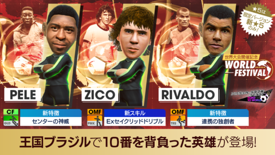 「サカつくRTW」初登場の「ジーコ」をはじめ、「ペレ」や「リバウド」など伝説的プレイヤーから、「リオネル・メッシ」、「ネイマール」、「ニコラス・タグリアフィコ」、「フアン・クアドラード」、「ダビンソン・サンチェス」、「ロドリゴ・ベンタンクール」といった現役のスター選手まで、南米のスーパースターたちが得意戦術「サイドアタック」の新★5選手として登場する“世界大会開催記念 LEGEND SCOUT”を開催中!