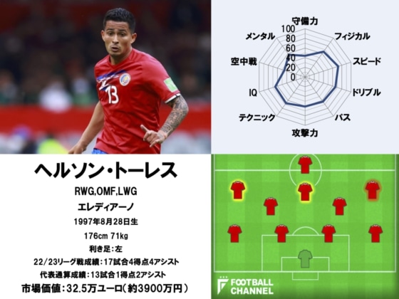 エレディアーノに所属する25歳のヘルソン・トーレスは、2017年にコスタリカ代表デビューを飾っている。その後しばらく代表から遠ざかったが、昨年に久しぶりの招集を果たすと、そこからは常連メンバーの1人に。カタールワールドカップ出場も掴み取ることになった。