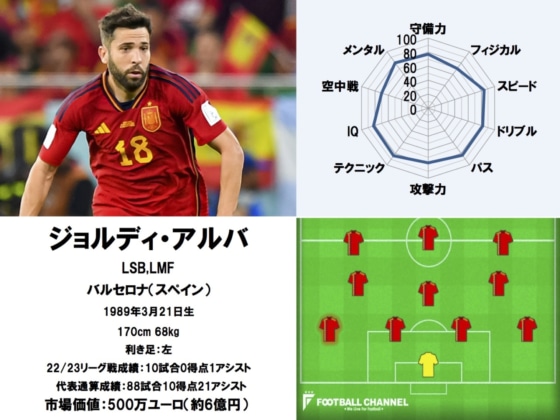 2位にランクインしたのは、約11年に渡りスペイン代表を支え続けるベテランDF、ジョルディ・アルバだ。今なお左サイドバックを不動のものとしているこの男が、自身3度目のワールドカップで日本代表と対戦する。