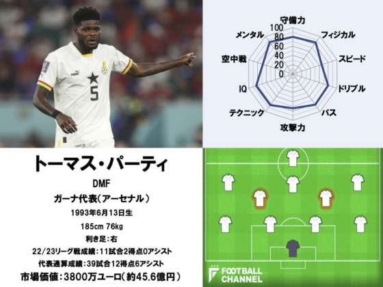 ガーナ代表の中盤には重戦車のような馬力が持ち味のトーマス・パーティが君臨している。所属するアーセナルでは他に代えの効く選手が全くいないほど重要な選手であり、昨季終盤の失速はトーマス・パーティ不在の影響がかなり大きかった。