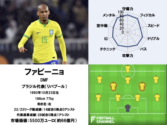 5位にはブラジル代表MFファビーニョがランクインした。所属するリバプールでは不動のアンカーだが、セレソン(ブラジル代表の愛称)では同じくワールドクラスのカゼミーロとポジションが被っており、現状はベンチメンバーを抜け出せずにいる。そのため本稿執筆時点ではワールドカップデビューを果たすことができていない。