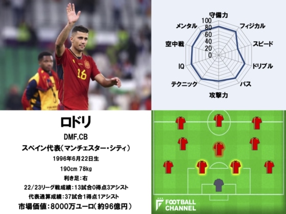 ロドリは「スピード」が「58」と足が速い選手ではないが、「IQ」の高さを生かしたポジショニング上手さと「フィジカル」の強さで「スピード」不足をカバー。「空中戦」も「80」と高い数値を叩き出しており、総合的に「守備力」の高い選手である。
