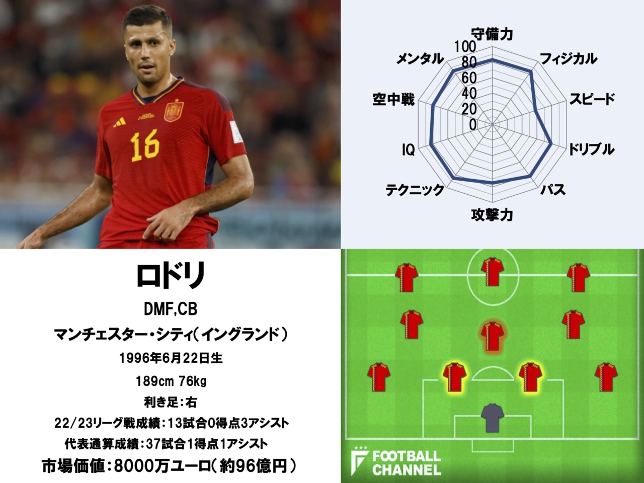 スペイン代表能力値ランキングの1位は、セルヒオ・ブスケッツの後継者と称される大型MFとなった。ビジャレアルやアトレティコ・マドリード時代に非凡な才能を発揮すると、2019年に移籍したマンチェスター・シティでジョゼップ・グアルディオラ監督の指導を受けさらにレベルアップ。今や世界最高峰の守備的MFとして、その名を世界に轟かせている。