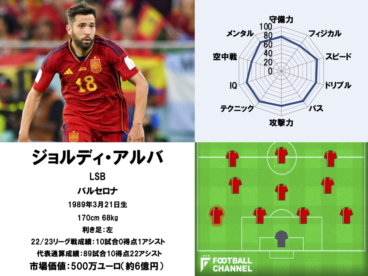 バルセロナ在籍10年目を迎えたベテランだ。サイドバックだが「攻撃力」に定評がある選手で、スペイン人らしい高度な「テクニック」と「パス」スキル、そして33歳になってもなお健在の「スピード」を生かして組み立てから崩しに至るまで幅広く貢献する。単独での突破力に優れるテオ・エルナンデスやヌーノ・メンデスなどとはまた一味違った攻撃的SBと言えるだろう。