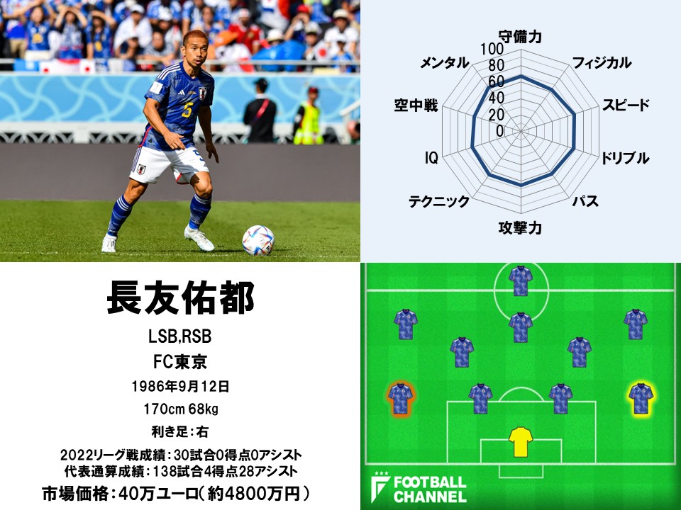 ポジションを争うライバルである山根視来ほどの「攻撃力」はないかもしれないが、弱点というわけでもない。馬力のある前線への飛び出しから繰り出すクロスは精度が高く、一列前の選手を生かすための“おとり”になるランニングも光るものがある。能力値を見ても「60」以下になった項目はなし。この攻守におけるバランスこそが、日本代表で長く活躍できる理由だ。