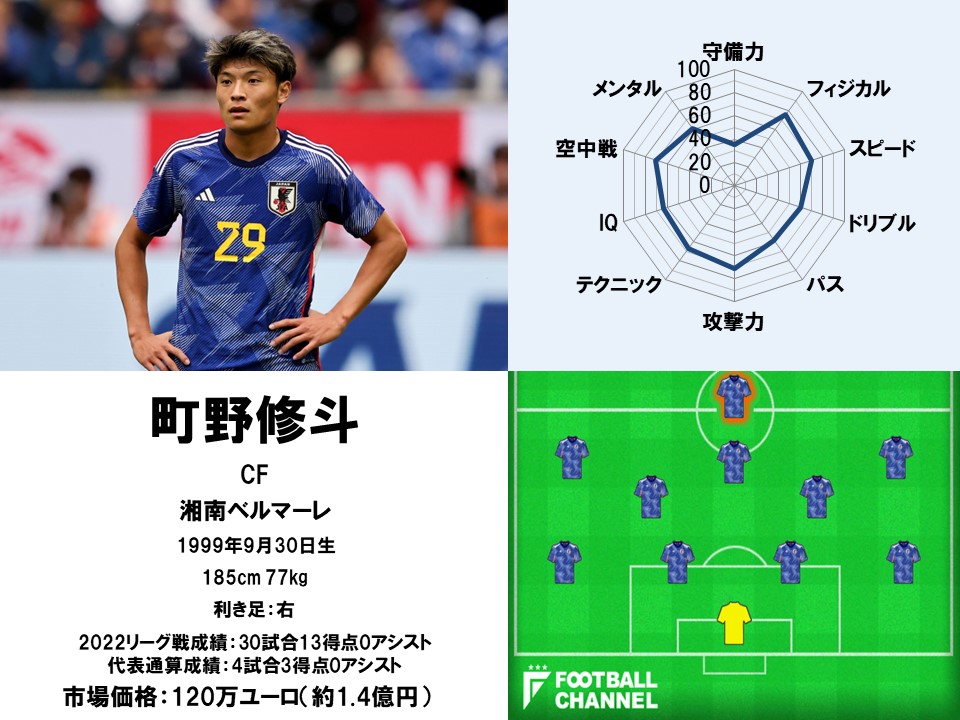 少なくとも1年前は代表候補のラージグループにもいなかったであろう若きFWが、ワールドカップイヤーの活躍を認められてメンバーに滑り込んだ。11月1日のメンバー発表後に中山雄太が負傷したことで、町野修斗が追加招集された。1トップのポジションとしては前田大然、浅野拓磨、上田綺世に次ぐ4番手と見られる。