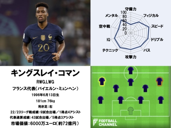 キングスレイ・コマンは、2012/13シーズンにパリ・サンジェルマンでプロデビュー以降、全シーズンでリーグ優勝を記録している世界屈指のタイトルホルダーだ。UEFAチャンピオンズリーグ(CL)の優勝経験もあるが、フランス代表では2018年の前回大会を怪我で欠場したため、ワールドカップでの優勝経験はない。