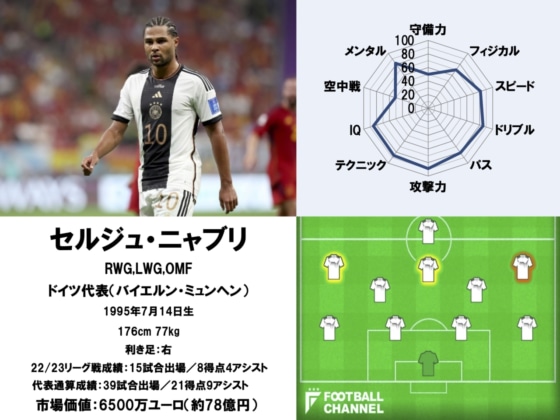 セルジュ・ニャブリはドイツ代表で10番を背負っている。エースナンバーを背負うに相応しい21得点9アシストという圧巻の数字を残しており、バイエルン・ミュンヘン時代に指導を受けたハンジ・フリック現代表監督の下でも絶対的な主力に定着している。