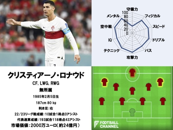 30代に入ってからは点取り屋という役割に専念するようになったロナウドだが、元々は「ドリブル」で局面を打開する典型的なWGタイプ。高い足元の技術で相手を翻弄し、一瞬の隙を突いてDFを置き去りにするほどの「スピード」にも定評があった。自ら仕掛け、チャンスを演出する場面は減少したものの、攻撃時に見せる存在感は未だ健在。今大会ではポルトガル代表の主将としてチームを牽引する。