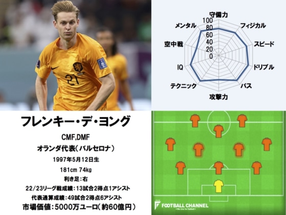 16位にランクインしたのは、オランダ代表MFフレンキー・デ・ヨングだ。U-15から各世代別代表で活躍した同選手は21歳でフル代表デビューを飾ると、瞬く間にチームに欠かせない絶対的な存在となった。
