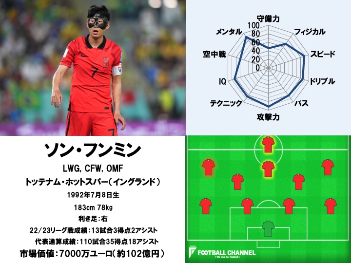 1分1敗と背水の陣で臨んだグループステージ最終戦・ポルトガル代表戦の後半アディショナルタイム。ソン・フンミンは自陣からのカウンターで劇的な決勝点を演出。このアシストで韓国代表を決勝トーナメント進出に導いた。