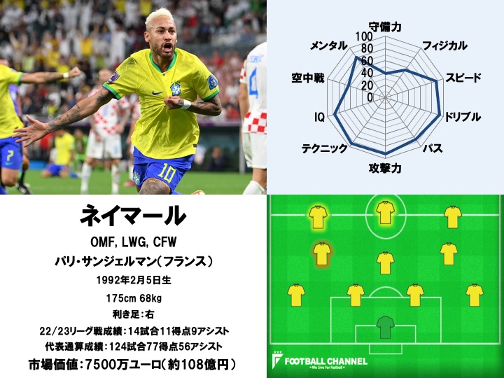 準々決勝のクロアチア代表戦でA代表通算77得点目を挙げ、ペレが持っているブラジル代表歴代最多得点記録に並んだ。50年以上にわたり破られなかった偉大な記録が塗り変わるまで、あと1点に迫る。
