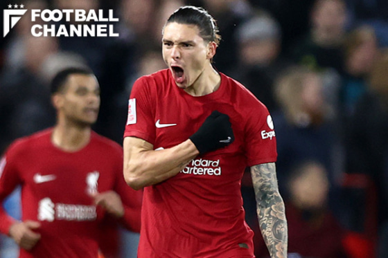 0-1で迎えた45分、相手DFが逆サイドへ送ったボールをトレント・アレクサンダー=アーノルドがカットし、頭で前へ運んでセンターサークル付近から相手DFラインの背後へロングパスを送る。すると、逆サイドで相手の背後に抜け出したダルウィン・ヌニェスがダイレクトシュート。上手く相手GKの逆を突き、同点弾を決めてみせた。
