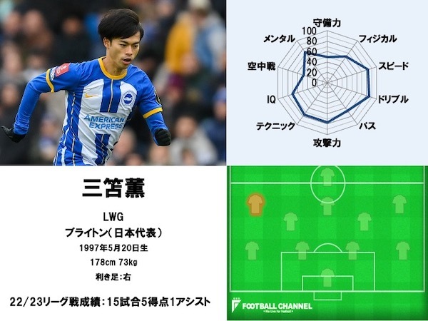 ベルギーのロイヤル・ユニオン・サン=ジロワーズで結果を残した三笘薫は、今季から保有元であるブライトンでプレーしている。当初こそ途中出場が多かったが、監督交代が追い風となり先発に抜擢されるようになった。右足の負傷から復帰したチェルシー戦で初アシスト、続くウォルバーハンプトン戦で初ゴールを記録した。日本代表での活躍によりその勢いは加速。12月下旬の公式戦再開からリーグ戦6試合4得点と大暴れだ。