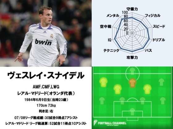 ヴェスレイ・スナイデルは、下部組織から在籍したアヤックスで中盤の選手ながら2桁ゴールを決めるなど目覚ましい活躍を見せると、23歳となった2007年に世界最高のクラブであるレアル・マドリードに引き抜かれた。