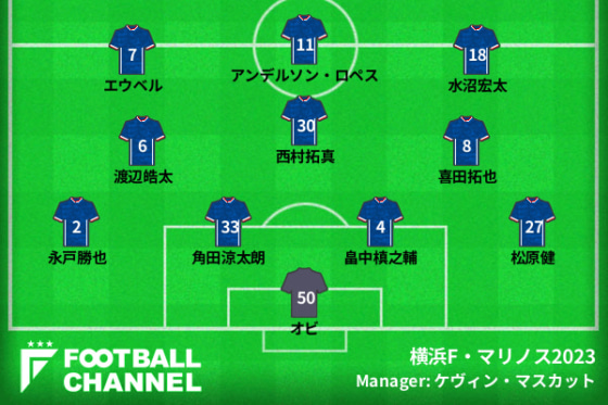 横浜F・マリノスのフォーメーションは以下の通り。データは2023シーズン開幕時のもの。