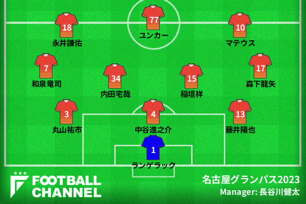 名古屋グランパスのフォーメーションは以下の通り。データは2023シーズン開幕時のもの。