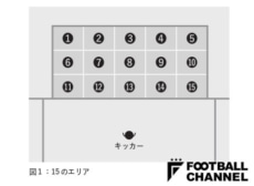 「PKの成功確率はどの程度なのか」というものだ。そこで、2014年以降の国際大会や欧州主要リーグにJリーグを含めたPKシーンの分析を実行した。その中から約1万シーンをランダムに無作為抽出した結果を見ていきたい。今回は図1のようにゴールの高さを3分割、横を5分割した15のエリアが存在すると仮定する。