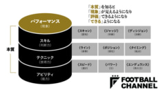 里は図1のようにアビリティ(能力)、テクニック(技術力)、スキル(判断力)=本質の表出であるパフォーマンス(現象)を構成する項目を9つにカテゴライズしている。里独自の「パフォーマンスチューブモデル」さえあれば、三笘以外の選手、もちろん他競技の選手も「評価」できてしまう。ちなみに「競走馬のサラブレッドもキャンター(駈走)であれば評価はできます」とも。