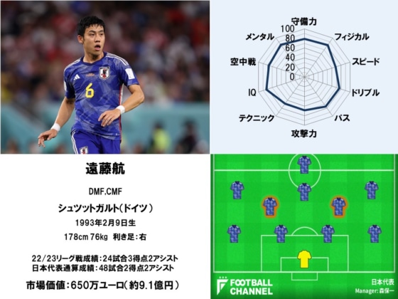 FIFAワールドカップカタールでの戦いを終え、次の時代に向けて新生サッカー日本代表が本格的に指導する。大きく顔触れが変わったメンバーの能力を様々なデータから数値化。各選手の能力値の平均値をランキングとして紹介する。(ポジションは日本代表でのもの。成績と市場価値は『transfermarkt』を参照)