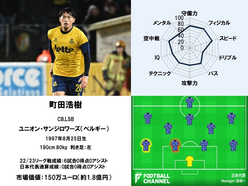 フィールドプレーヤー最長身となる190cmの体躯に搭載された身体能力が武器で、「フィジカル」「スピード」「空中戦」といった項目は今回のチームの守備陣ではトップクラスの数値を残す。さらに、左足から放たれるフィードも絶品。ユニオン・サンジロワーズで昨季ともにプレーした三笘薫とのコンビは日本代表でも見てみたい。