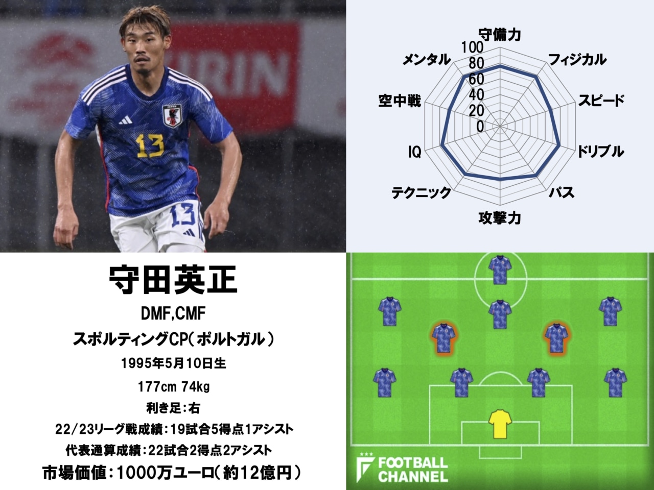 「フィジカル」で圧倒できる選手ではないが、読みが鋭く、タックルを仕掛けるタイミングも抜群とクレバーなディフェンスには定評があり、「守備力」も「76」と高評価になった。飛び抜けた武器こそないかもしれないが、ウィークポイントも目立たない。この万能性こそ、守田が日本だけでなく世界でも確かな評価を得ている理由だ。