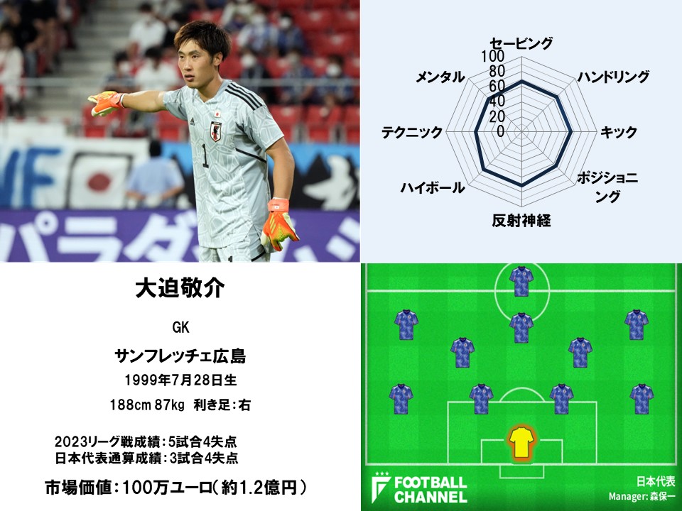 FIFAワールドカップカタールでの戦いを終え、次の時代に向けて新生サッカー日本代表が本格的に始動する。大きく顔触れが変わったメンバーの能力を様々なデータから数値化。GK全3選手の能力値の平均値をランキングとして紹介する。(ポジションは日本代表でのもの。成績と市場価値は『transfermarkt』を参照。情報は3月26日時点)